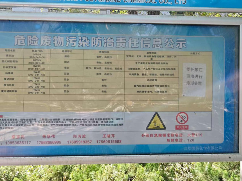 我濰坊碩邑化學(xué)有限公司現(xiàn)有危險(xiǎn)廢物八種,分別為廢活性炭(HW49 900-039-49)、乳化劑等助劑包裝物(HW49 900-041-49)、油漆桶(HW49 900-041-49)、廢試劑瓶(HW49 900-041-49)、化驗(yàn)室廢液(HW49 900-047-49)、廢機(jī)油桶(HW08 900-249-08)、廢機(jī)油(HW08 900-214-08)、廢過濾吸附物(HW49 900-041-49)。